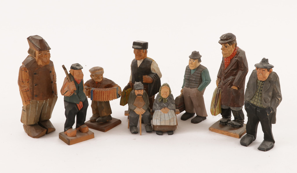 Bilder Träskurna figurer 8st, bl.a. Gunnar Hedin