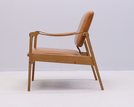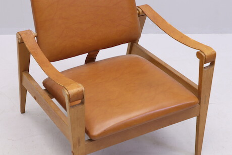 Fåtölj, 1960-tal, stomme i ek, armstöd i läder, sits och rygg klädda i galon, bredd 68 cm
