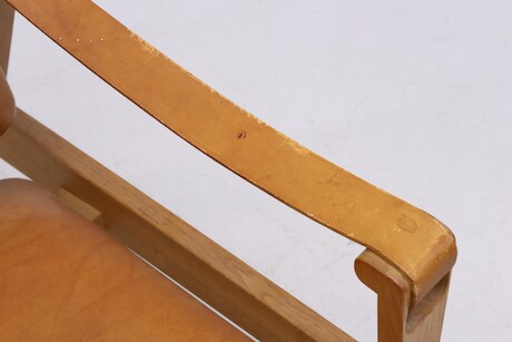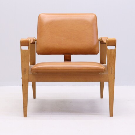 Bilder Fåtölj, 1960-tal, stomme i ek, armstöd i läder, sits och rygg klädda i galon, bredd 68 cm