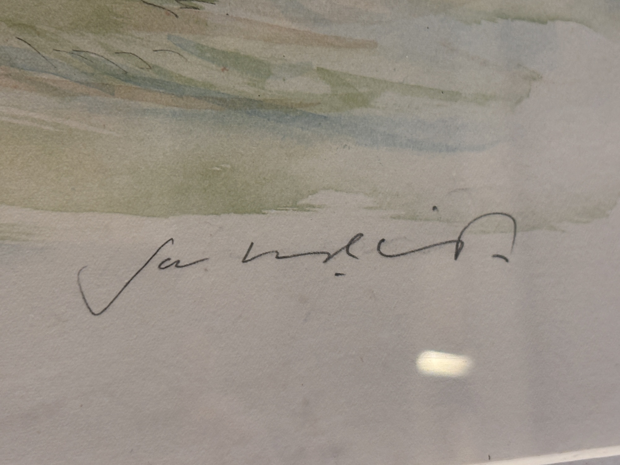 Stämningsfullt konstverk av Jan Westin, föreställande Uppsala kyrka omgiven av träd och lugnt landskap, utfört i mjuka akvarelltoner. Westin är känd för sina detaljerade och harmoniska skildringar av svenska stadsmiljöer och kyrkor, och detta motiv är ett fint exempel på hans lyriska bildspråk.