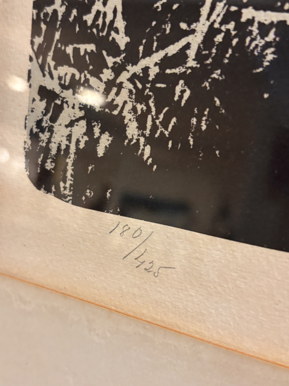 Bladet är handsignerat och numrerat 180/435, vilket anger en begränsad upplaga. Monterad i ram med passepartout.