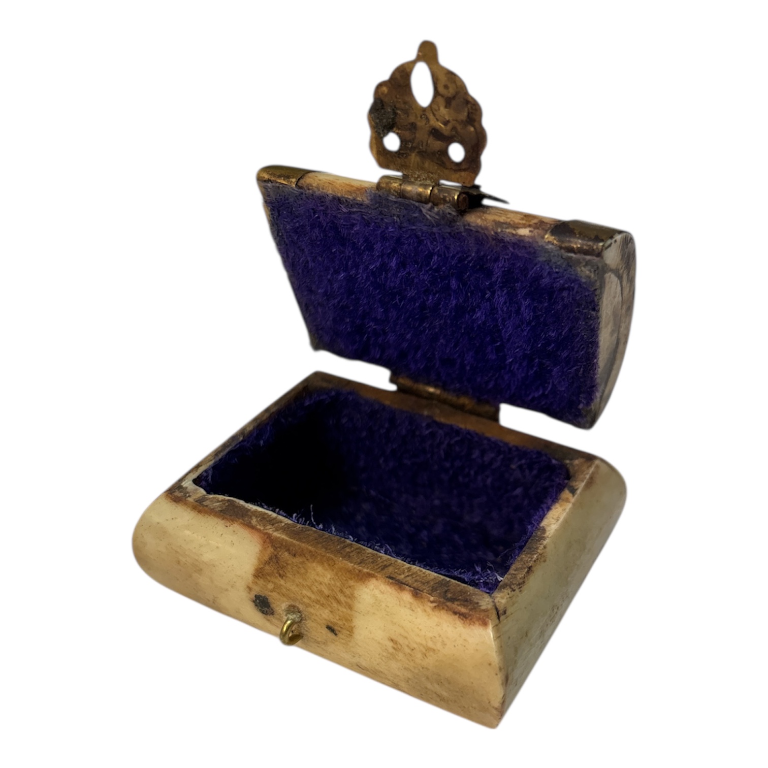 Rektangulär dosa utförd i ben/tänder ofta från Kamel , rikt dekorerad med geometrisk intarsia och infällda mässingsdetaljer i form av cirklar och linjer. Lock med gångjärn och låsbeslag i mässing. Ytan uppvisar naturlig patina, åldersrelaterade missfärgningar och mindre slitagemärken som är förenliga med äldre hantverk.