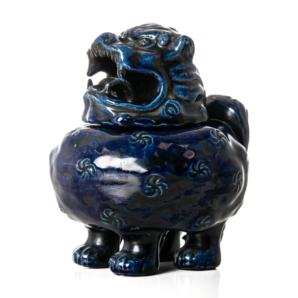 A CHINESE CENSER, blue glazed in the shape of a foo dog, 19th/20th century.