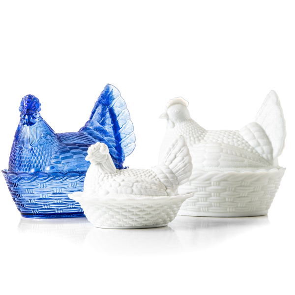 ÄGGHÖNOR, 3 st, en blåtonad samt två vita, pressglas, 1900-tal.
