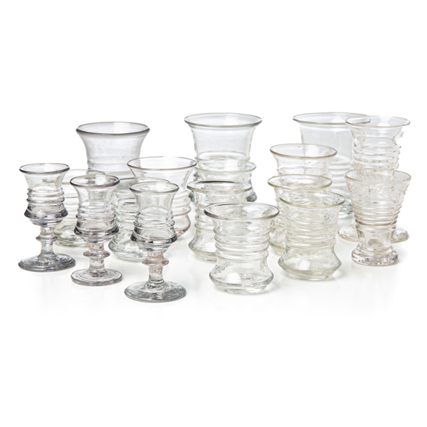 LÄNSMANSGLAS, 17 st, 1800-tal, olika storlekar och modeller med ribbad dekor, en bär gravyr