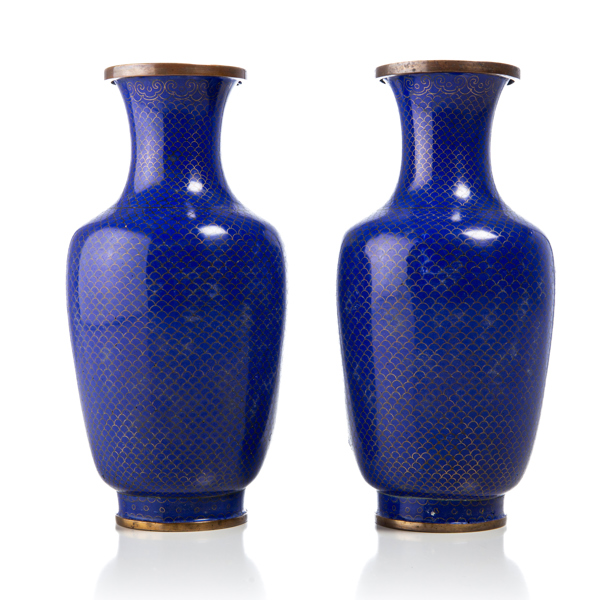 A PAIR OF CHINESE VASES, Cloisonné, blue enamel with fish scale pattern on brass, 20th century.