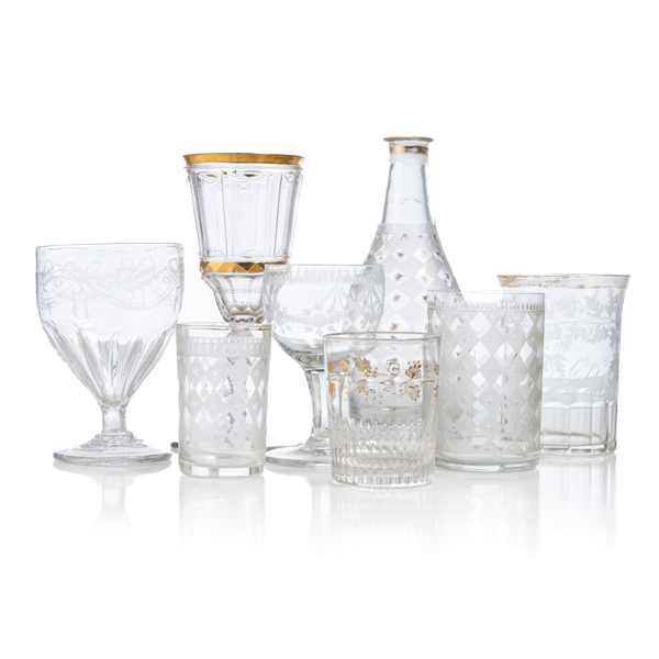 GLAS, 8 stycken, 1800-tal, med etsad dekor, varav två stycken med förgyllning