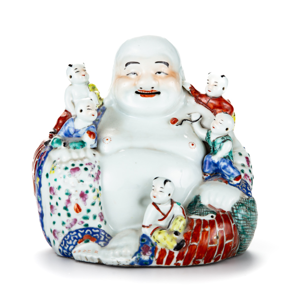 A CHINESE FIGURE OF BUDDHA, surrounded by children, with unknown markings, 19th/20th century.