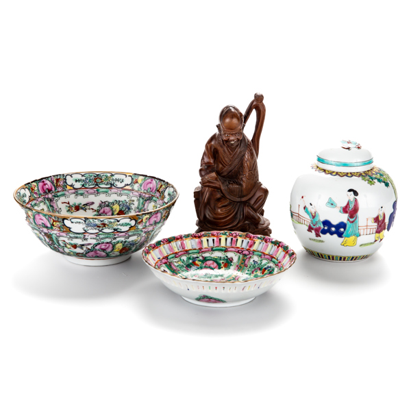 CHINESE PORCELAIN AND WOODEN FIGURE, 4 pieces, modern production.