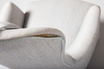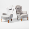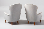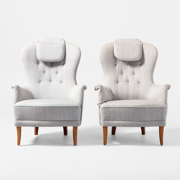 CARL MALMSTEN, fåtöljer, ett par, "farmor", O.H Sjögren Tranås, tillverkade 1983, etikettmärkta. Gråmelerad textilklädsel, på ben av betsad bok. Löstagbara nackkuddar medföljer