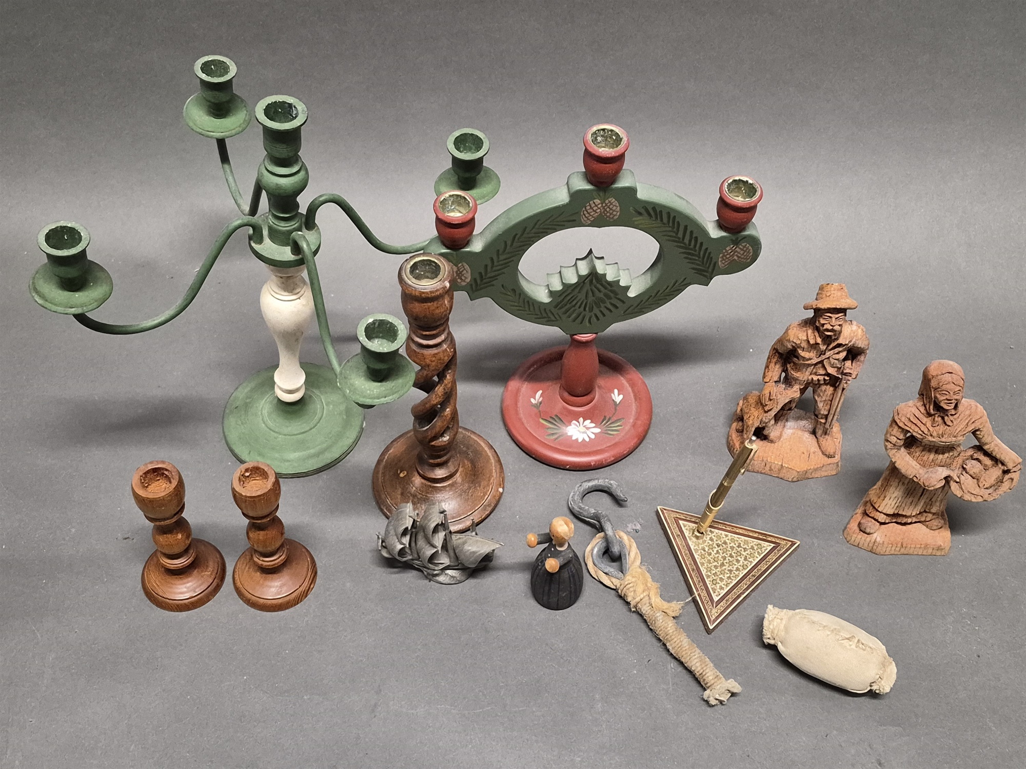 Parti träföremål, bla skulpturer ljusstake högsta 25 cm