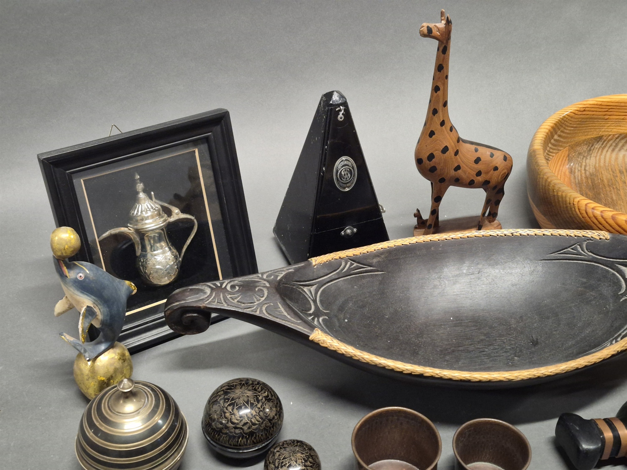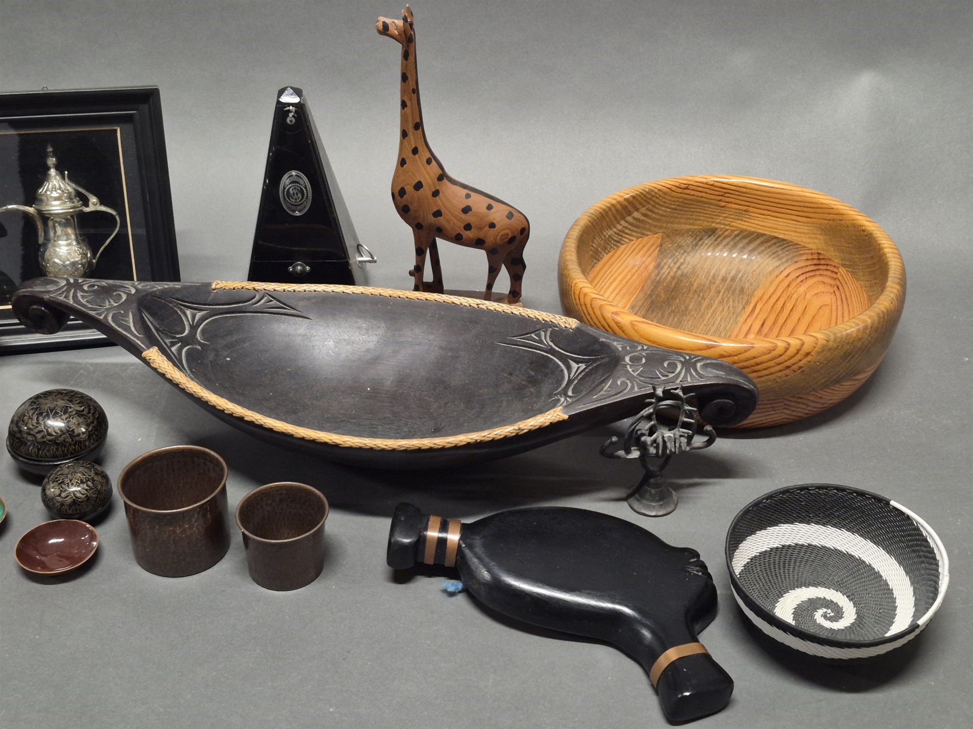 Parti träföremål bl.a fat & metallkanna i monter högsta 28 cm