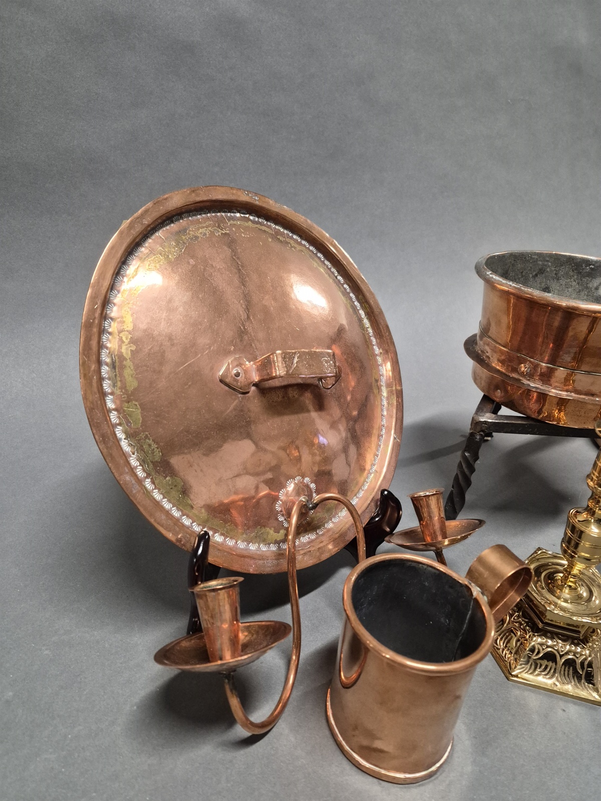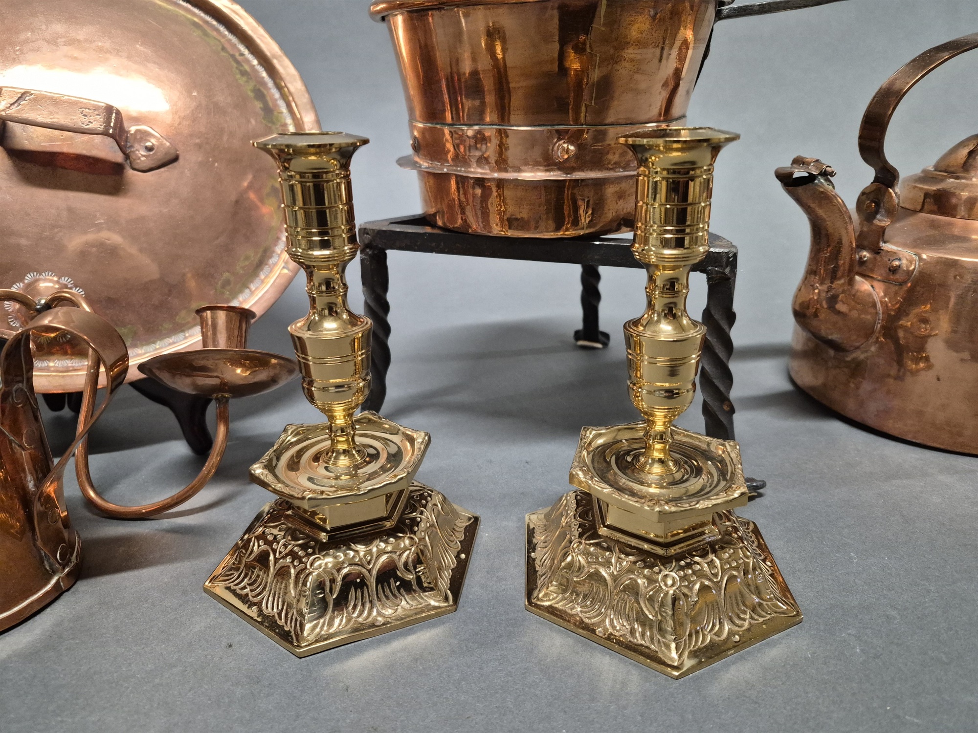 Bilder Parti kopparföremål bla kaffepanna och mässingljusstakar 1 par Ystad Metall, höjd på ljusstakar 18 cm