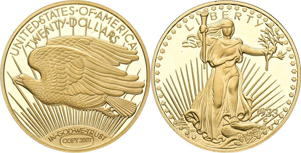 USA. "20 dollars" 2005. Copy of 1933 20 dollars. 9,78 g. (585/1000)
