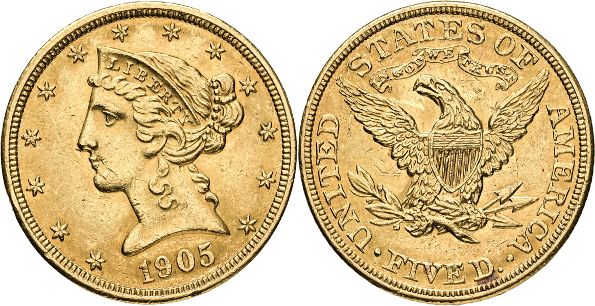 USA. 5 dollars 1905. 8,35 g. (900/1000)