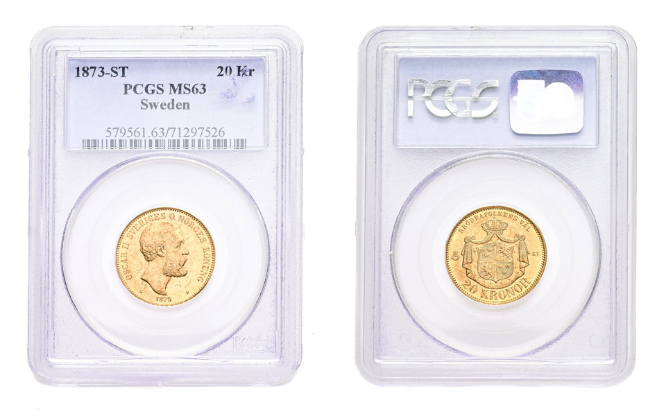 SLAB. 20 kronor 1873. 8,96 g. (900/1000). I slab graderad MS 63