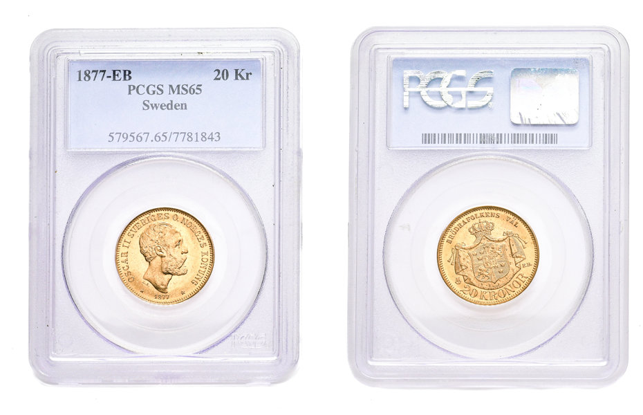 SLAB. 20 kronor 1877. 8,96 g. (900/1000). I slab graderad MS 65