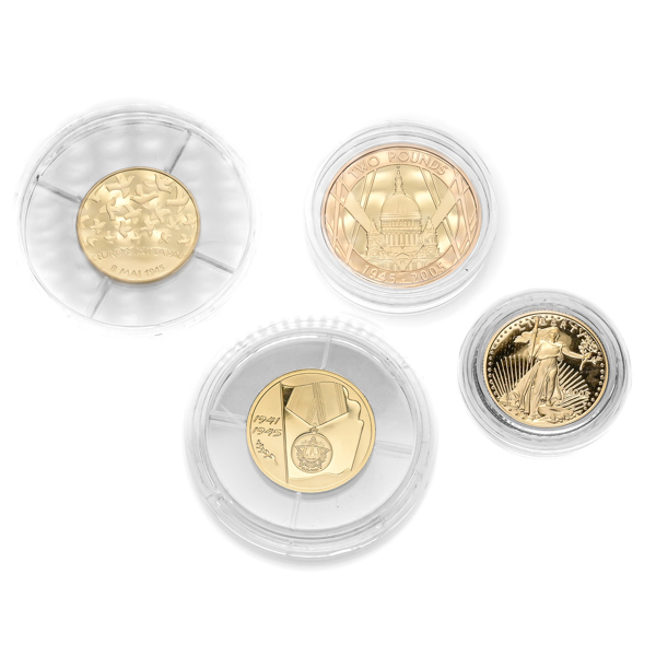 SET. WWII. Allied forces 1945-2005. 2 pund (15,97 g, 917/999), 10 euro (8,45 g, 920/1000), 10 dollars (8,48 g, 917/1000), 50 rubel (7,89 g, 999/1000). I originaletui