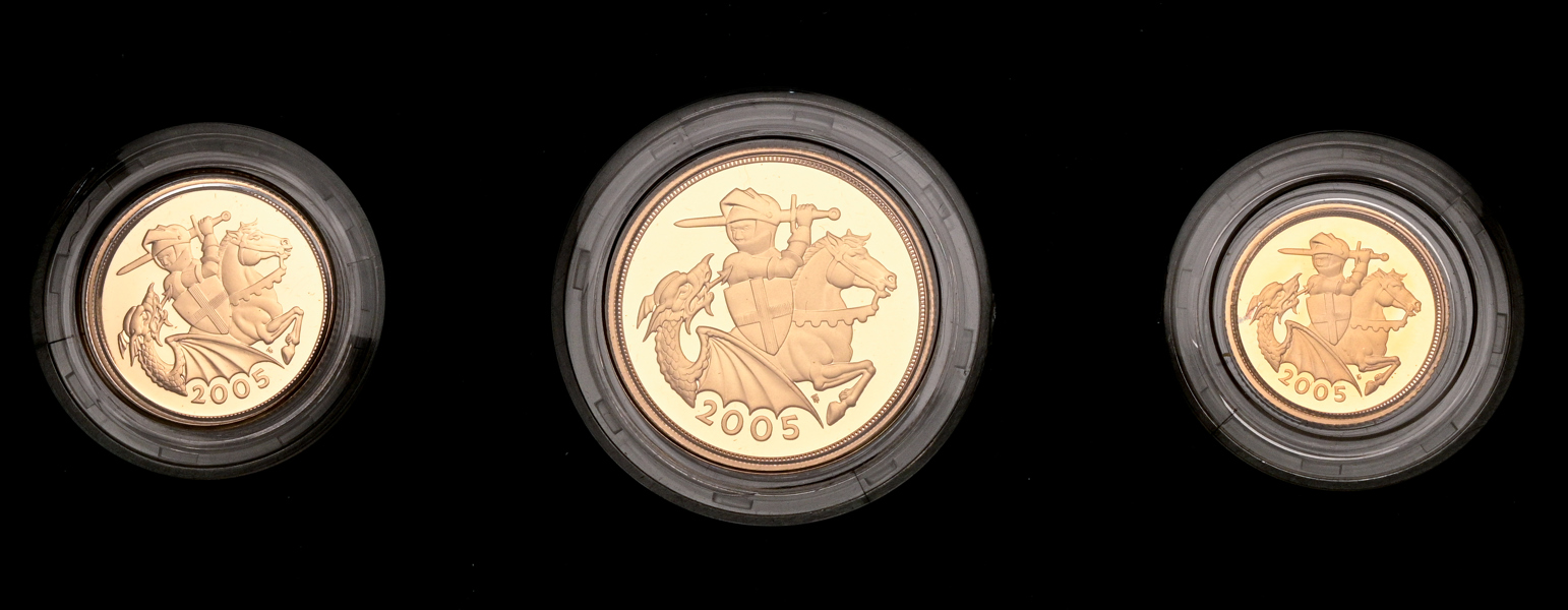 SET. STORBRITANNIEN. Gold proof three-coin sovereign collection. 3 mynt med totalvikt ca 28 g. (917/1000). I originaletui