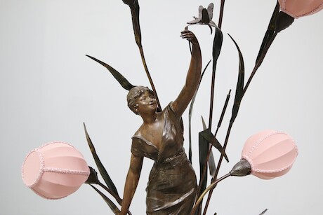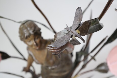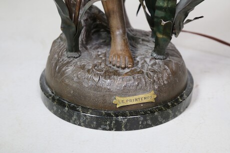 Bilder Bordslampa brons på stensockel med textilskärmar 1900-tal brickmärkt Le Printemps H=110