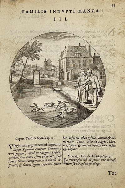 "Familia Innupti Manca." This circular engraving depicts a domestic scene at a pond where a mother and her child observe ducks swimming. In the background, a grand house and garden are visible, set within a classical landscape. This emblem originates from the book Silenus Alcibiadis, sive, Proteus, published in Middelburg by Johannes Hellenius in 1618. The work serves as a moral allegory concerning family and domestic life, utilizing the imagery of the ducks and the household to reflect on the importance of paternal presence and traditional social structures during the Dutch Golden Age.