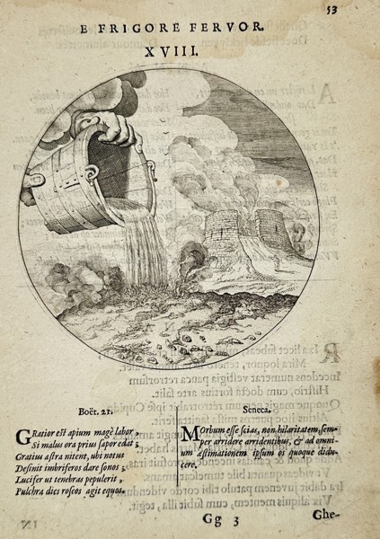 "E Frigore Fervor." This circular engraving depicts a large bucket pouring water onto a pile of lime, which reacts by producing clouds of heat and steam. In the background, kilns and a landscape are visible under a cloudy sky. This emblem is part of the work Silenus Alcibiadis, sive, Proteus, published in Middelburg by Johannes Hellenius in 1618. The image serves as a moral metaphor, illustrating how external challenges or cold circumstances can ignite internal passion or energy, much like water causing lime to heat.