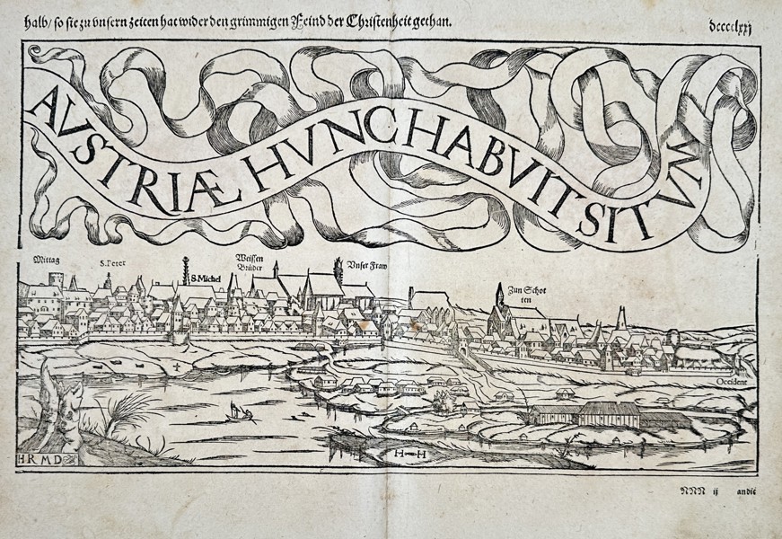 "Austria Hunc Habuit Situm." This woodcut provides a panoramic view of the city of Vienna as it appeared in the mid-sixteenth century. The composition features a large, decorative banderole across the upper section containing the Latin title, while the city skyline highlights prominent landmarks such as Saint Stephens Cathedral and various monastic buildings. This print was published in the Cosmographia, a monumental work printed in Basel by Heinrich Petri. The Cosmographia was one of the most successful and popular descriptions of the world in the sixteenth century, combining geographical data with historical anecdotes and numerous illustrations to provide a comprehensive overview of known lands.