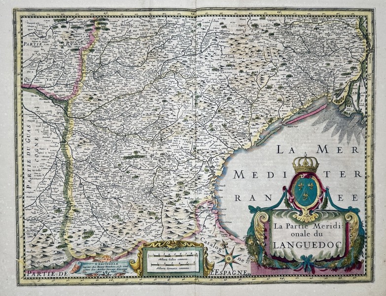 "La Partie Meridionale du Languedoc." This map provides a detailed cartographic representation of the southern region of Languedoc, France, bordering the Mediterranean Sea. The composition features a large, decorative title cartouche in the lower right corner, topped with a royal crown and the French fleur-de-lis. A secondary cartouche at the bottom center contains multiple linear scales. The map illustrates the coastal geography, major river systems, and numerous towns and villages of the region, rendered with precise topographical detail. This engraving was published in the Atlas Novus, an expansive geographical work produced in Amsterdam, which served as one of the most significant and influential atlases of the seventeenth century.