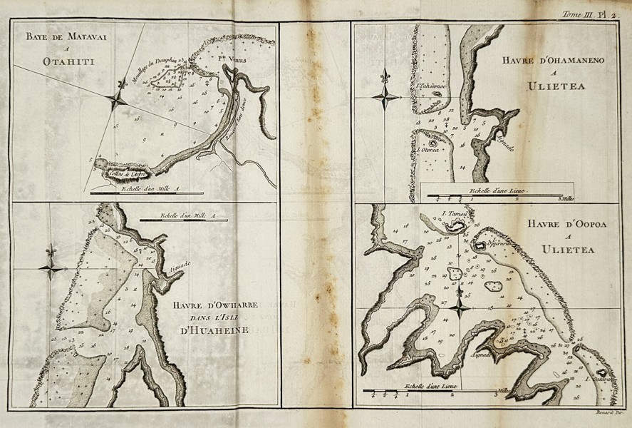 "Baye de Matavai a Otahiti," "Havre d'Owharre dans l'Isle d'Huaheine," "Havre d'Ohamaneno a Ulietea," and "Havre d'Oopoa a Ulietea." This print features four distinct hydrographic charts on a single sheet, documenting the coastal findings from the first voyage to the South Pacific. The upper left chart shows Matavai Bay, where the transit of Venus was observed, while the remaining charts detail natural harbours in the Society Islands. These engravings were published in the French edition of the official account of the voyages, printed in Paris by Saillant and Nyon. The work is a fundamental record of maritime exploration, providing the first accurate European cartography of the Polynesian islands and their navigable waters.