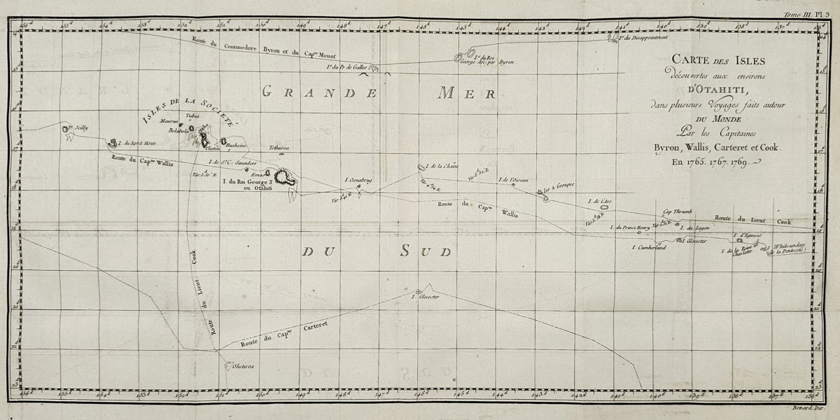 "Carte des Isles decouvertes aux environs d'Otahiti, dans plusieurs Voyages faits autour du Monde Par les Capitaines Byron, Wallis, Carteret et Cook En 1765. 1767. 1769." This engraving provides a large-scale maritime chart of the Society Islands in the South Pacific, including Tahiti and surrounding archipelagos. The map tracks the specific routes taken by four major British explorers, with the track of Captain Cook's HMS Endeavour clearly marked among the islands. This plate was published in the French edition of the official account of the voyages, printed in Paris by Saillant and Nyon. It serves as a primary cartographic record of the first European encounters with these islands, utilizing astronomical observations to establish their precise global coordinates for the first time.
