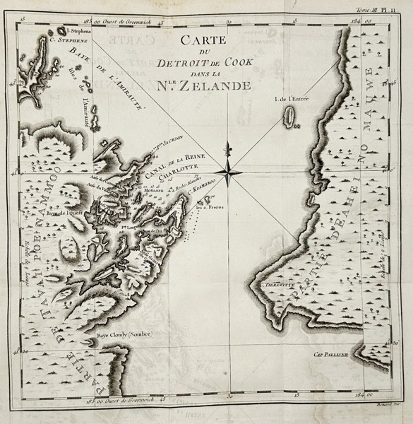 "Carte du Detroit de Cook dans la N.le Zelande." This maritime chart provides a detailed topographical and hydrographic survey of the strait separating the North and South Islands of New Zealand, now known as Cook Strait. The map features a prominent compass rose at the center and identifies various coastal landmarks such as Queen Charlotte Sound, Admiralty Bay, and Cape Palliser. This engraving was published in the French edition of the official account of the voyages, printed in Paris by Saillant and Nyon. It represents a significant milestone in Pacific exploration, being the first European chart to accurately document the navigable passage through the New Zealand archipelago.