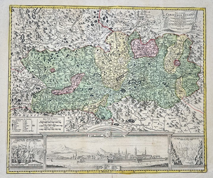 "Carinthiae Ducatus. Tabula geographica in Superiorem et Inferiorem divisa." This hand-coloured engraving presents a comprehensive geographical survey of the Duchy of Carinthia, divided into its Upper and Lower regions. The cartography emphasizes the dramatic alpine topography of the region, meticulously depicting the mountain ranges, valleys, and river systems that define the southern Austrian landscape. The map features vibrant hand-colouring to distinguish internal administrative borders and surrounding territories. At the bottom of the plate, a large panoramic inset provides a topographical view of Klagenfurt, the provincial capital, shown with its urban fortifications and prominent church spires against a mountain backdrop. A decorative title cartouche is positioned in the upper right corner, while the lower left contains a detailed key and various scale bars. This work was published in Nuremberg and serves as a significant record of the territorial geography of the Holy Roman Empire during the early eighteenth century.