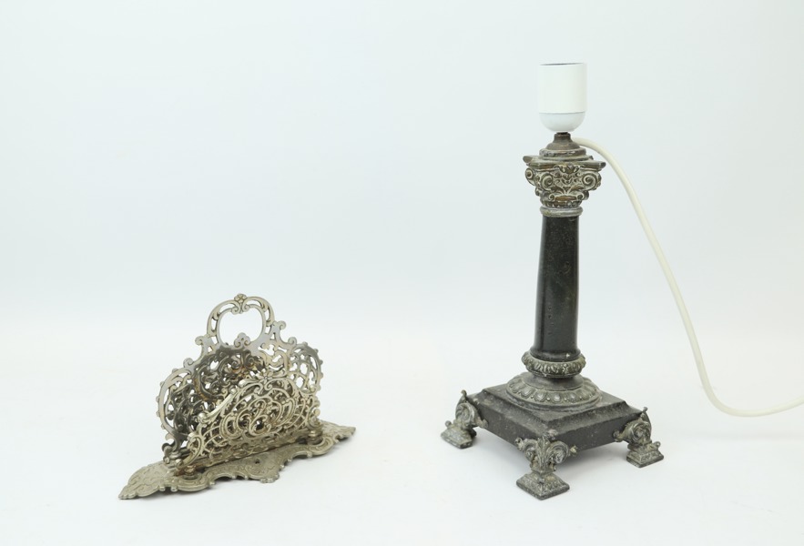 Brevställ och bordslampa, metall/sten.