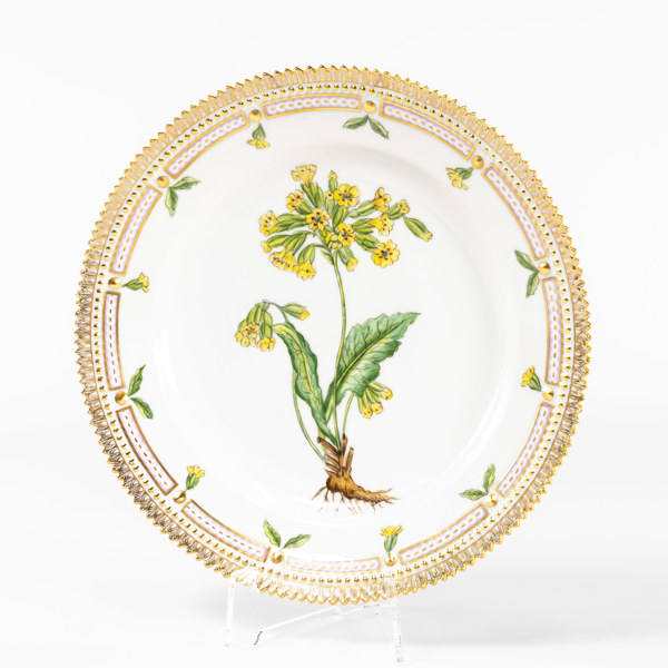 Tallrik, "Flora Danica", "Primula Veris - Gullviva", senare bemålade, målarsignerad "S. AxA", daterad 1953, modellnummer 20/3550, tredjesortering, Royal Copenhagen, Danmark, diameter ca 22 cm