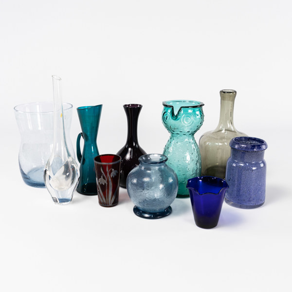 Vaser, bringare, 10 delar, bl. a. bringare i form av uggla, högsta 26 cm
