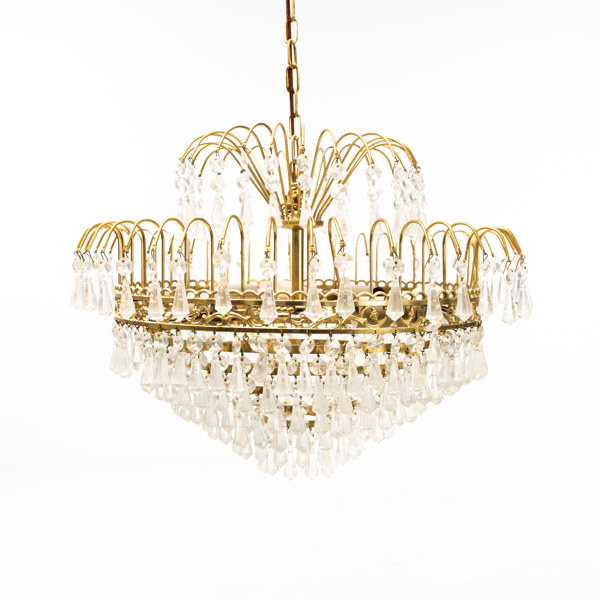 Ljuskrona med prismor, stomme i gulmetall, 6 ljuspunkter, 1900-talets andra hälft, diameter ca 44 cm