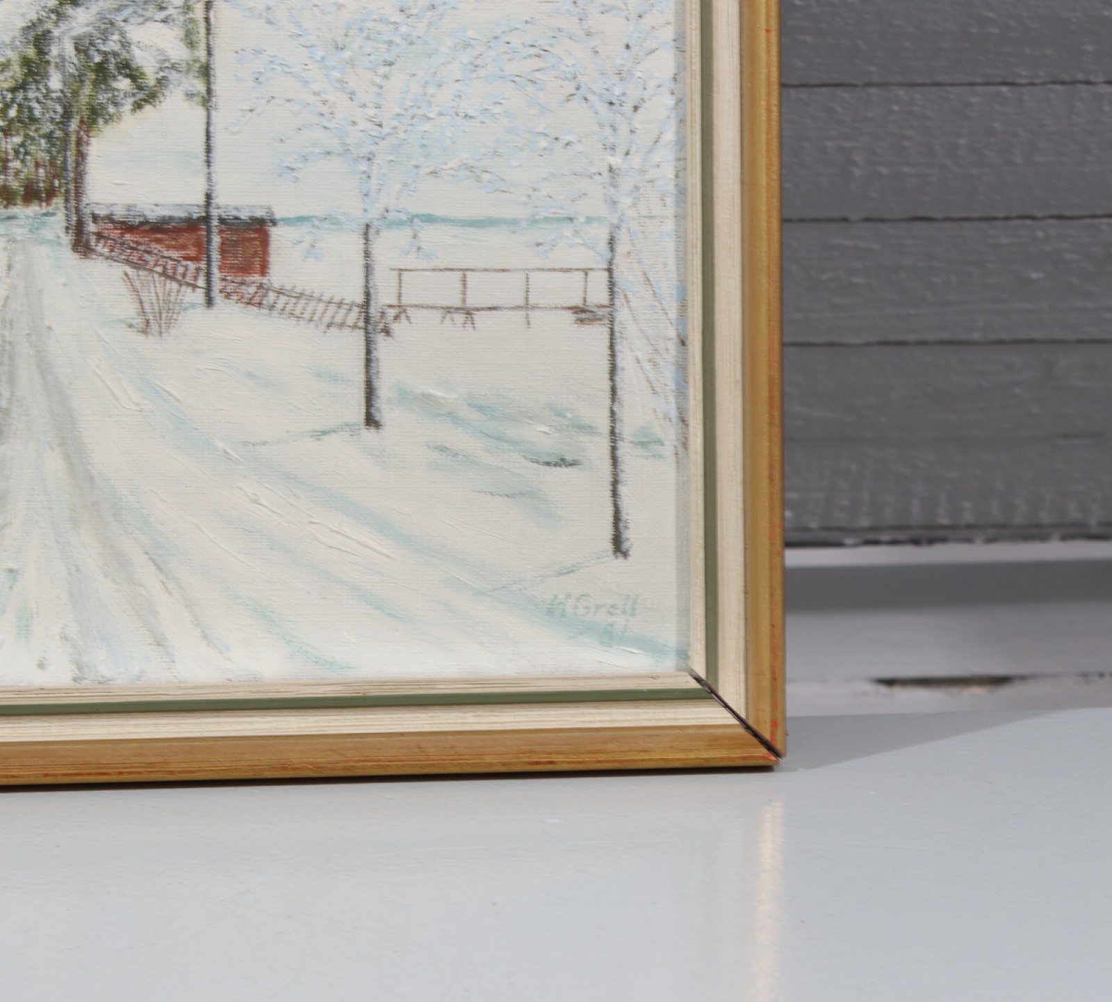 Olja på duk, "Mor Ullas stuga, Näset, Karlskoga", signerad H. Grell samt daterad -81, ram 43x51 cm, bild 37x45 cm. (vån3)