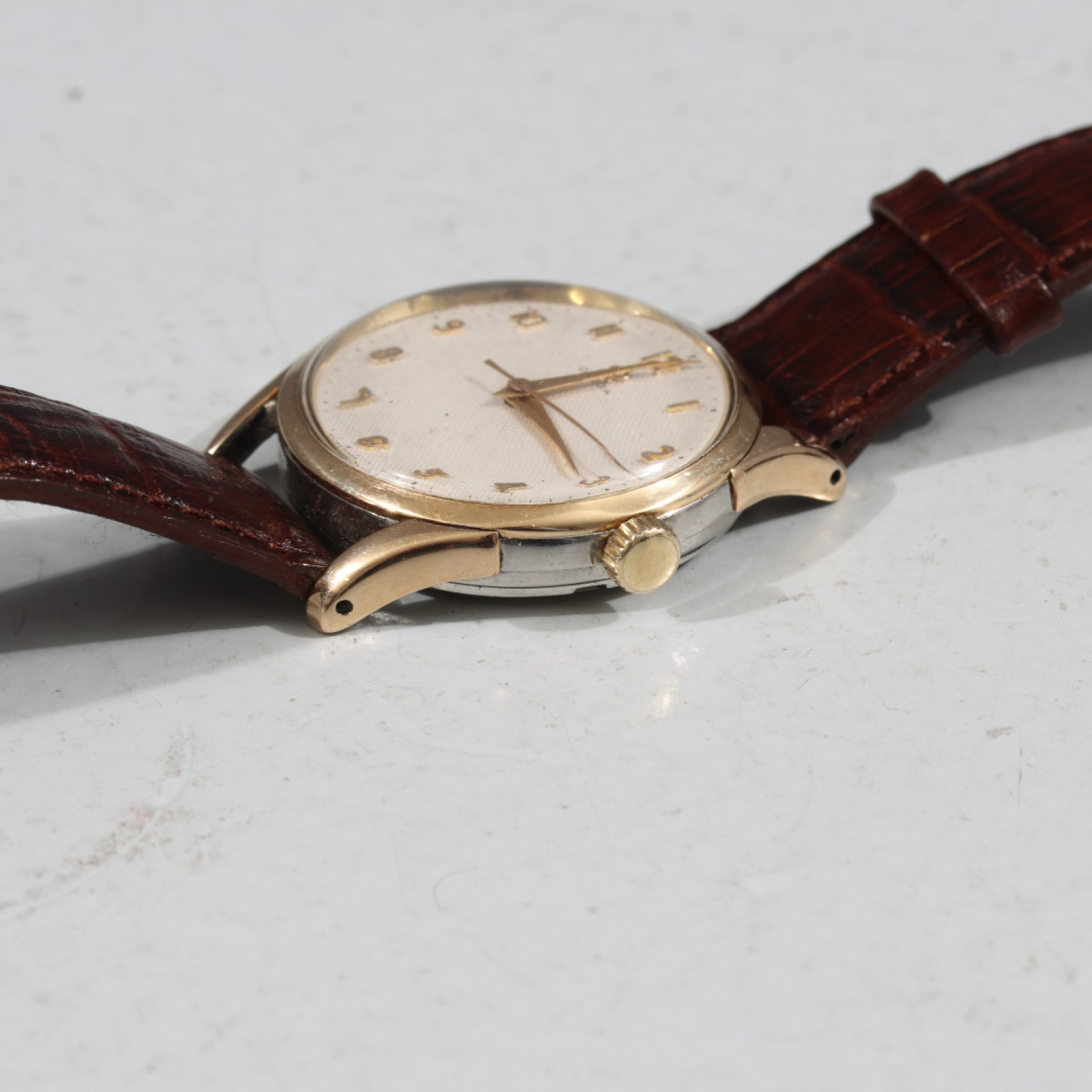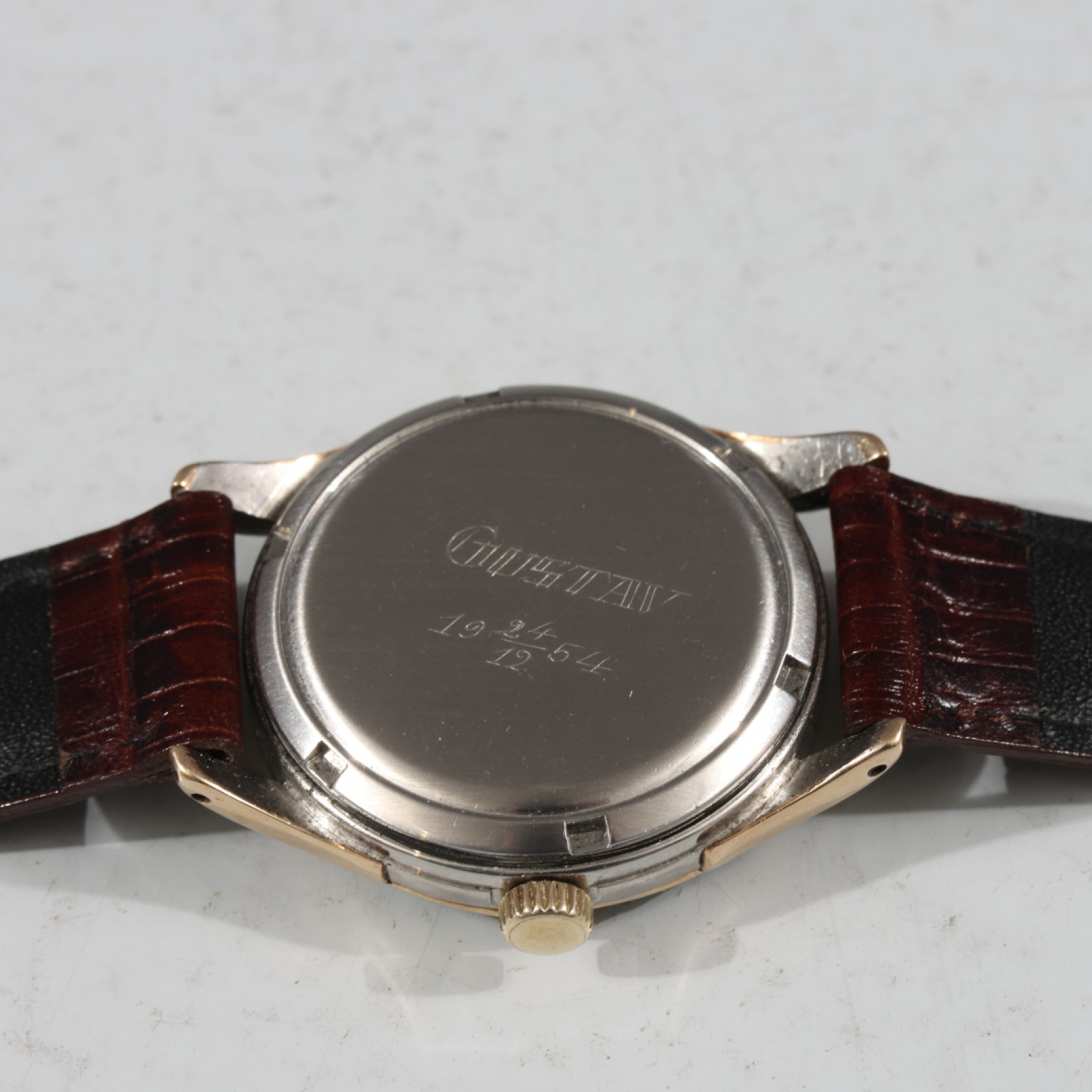 Guld på stål, manuell, 1950-tal, boett med gåvogravyr, gångbar vid kontroll, bredd utan krona 35 mm. (vån3)