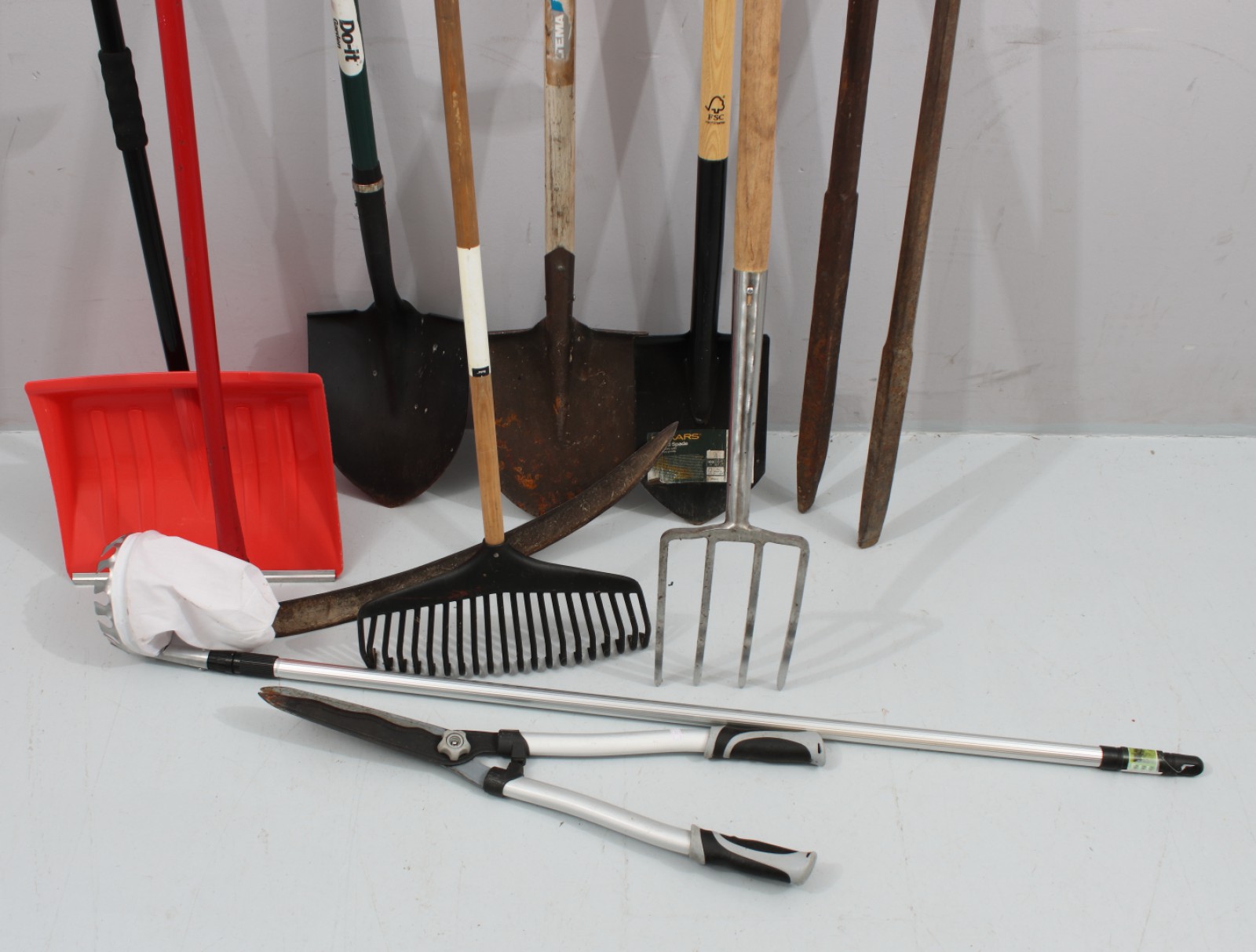 Samling, bl.a lie, spadar och 2st järnspett, för detaljer se bilder. (vån1)