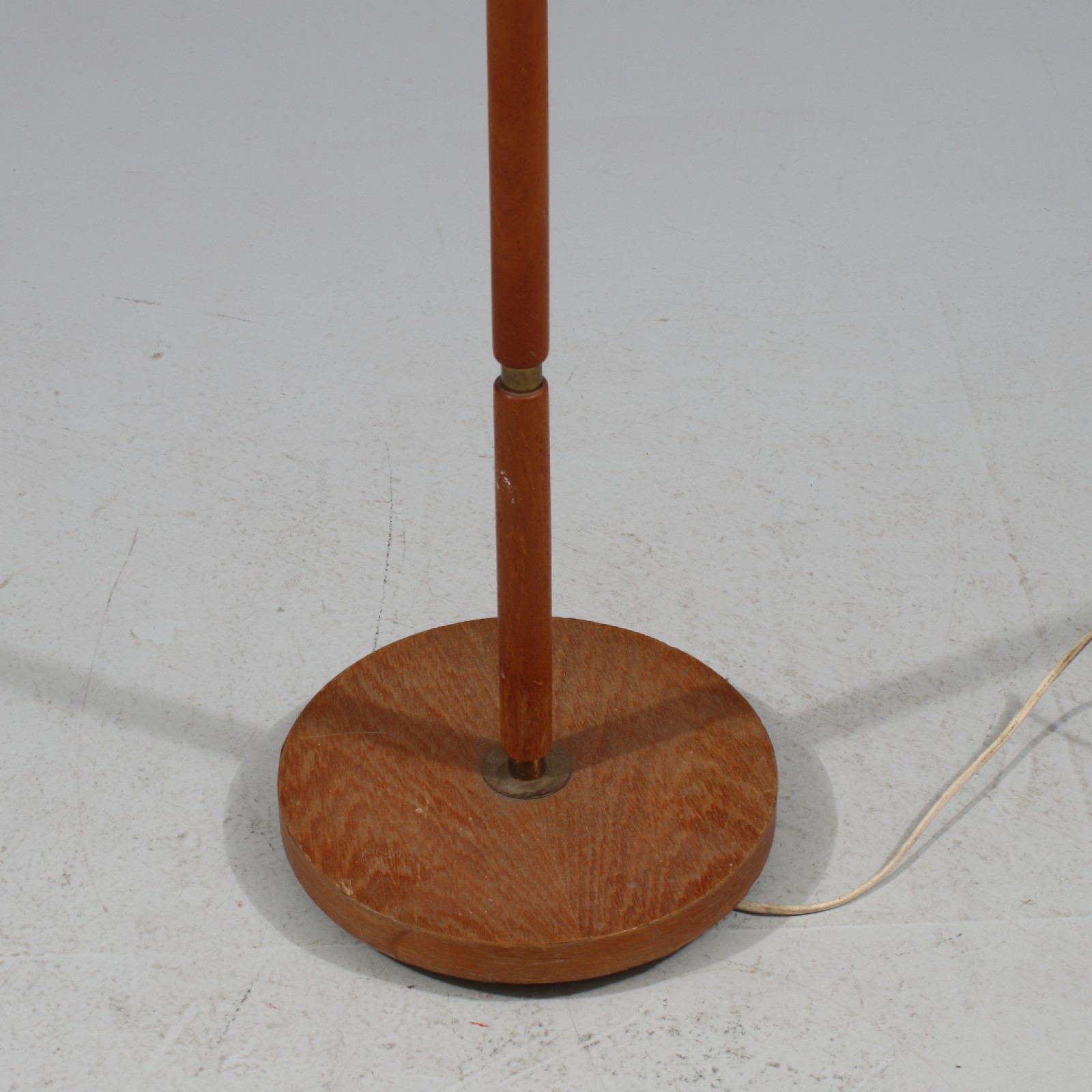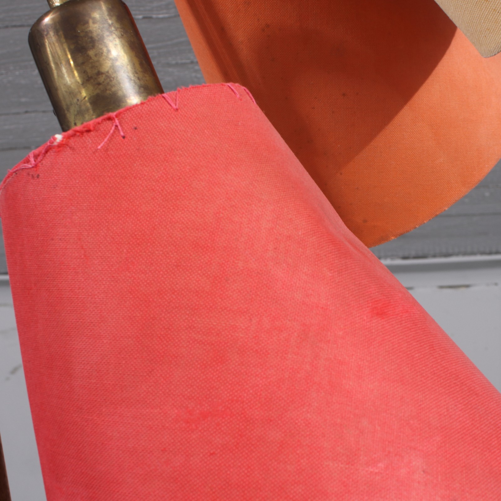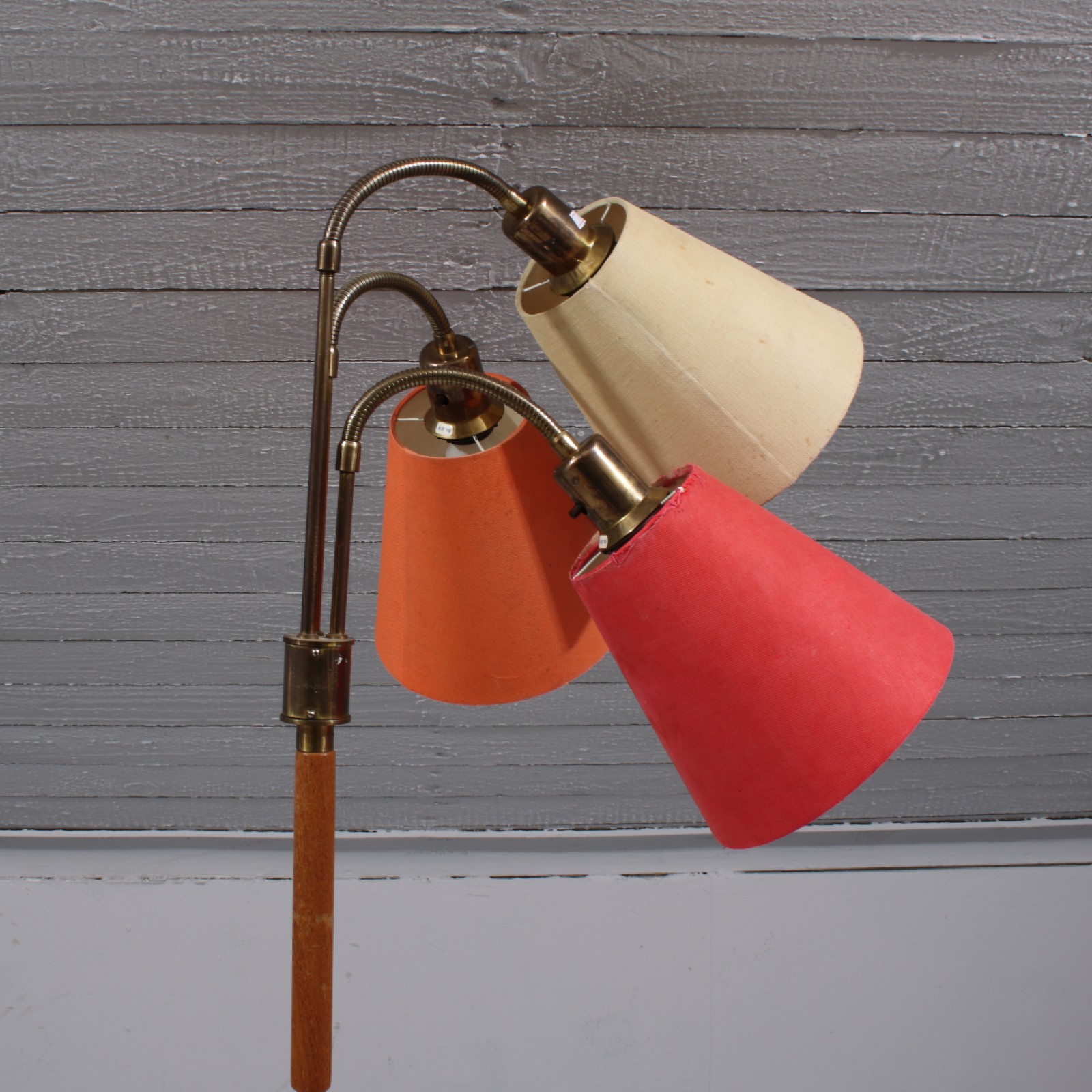 ÖIA Typ 13, lövträ och mässing, tygklädda skärmar, 1950,60-tal, 3-armad, senare skärmar, åldersrelaterat slitage, tyg ställvis smutsigt/fläckar. (vån2)