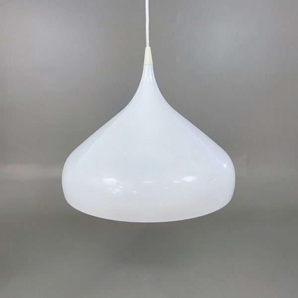 Taklampa från &Tradition, modell Spinning BH2. Formgiven av Benjamin Hubert år 2010. Lampan är i blank vitlack och har vit textilsladd.