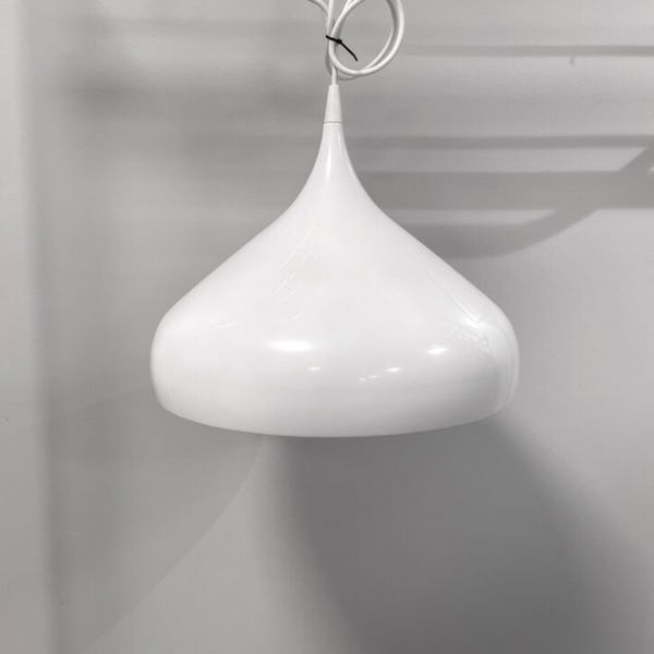 Taklampa från &Tradition, modell Spinning BH2. Formgiven av Benjamin Hubert år 2010. Lampan är i blank vitlack och har vit textilsladd.
