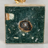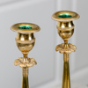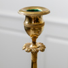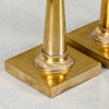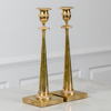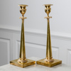Brännförgylld mässing. Kvadratiska fotplattor med träplatta undertill. Koniska pelare med plym. Urnformade ljuspipor.