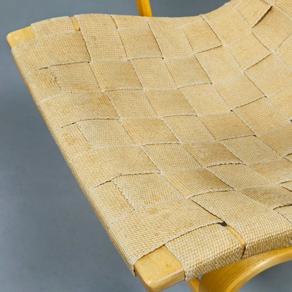 Superfin Evafåtölj med hög rygg. Stommen är i bok och flätad sadelgjorden i natur. Brännmärkt med Bruno Mathsson Made in Värnamo 1971. Visst slitage på stommen och sadelgjorden är lite slapp. Smärre fläckar.
