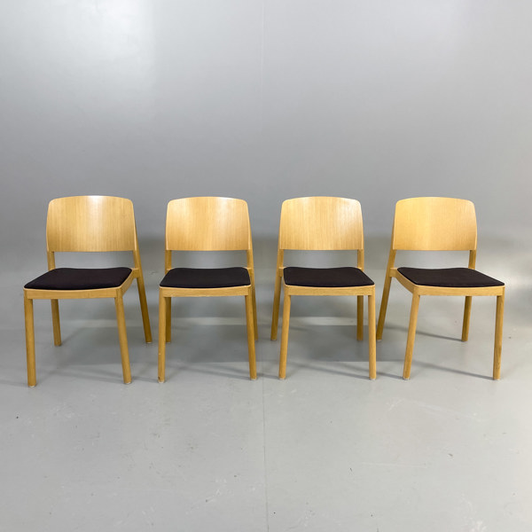 4 stycken stolar från Swedese, modell Grace. Formgiven av Staffan Holm. Stol i ek med stoppad sits i mörk brun-blått tyg.