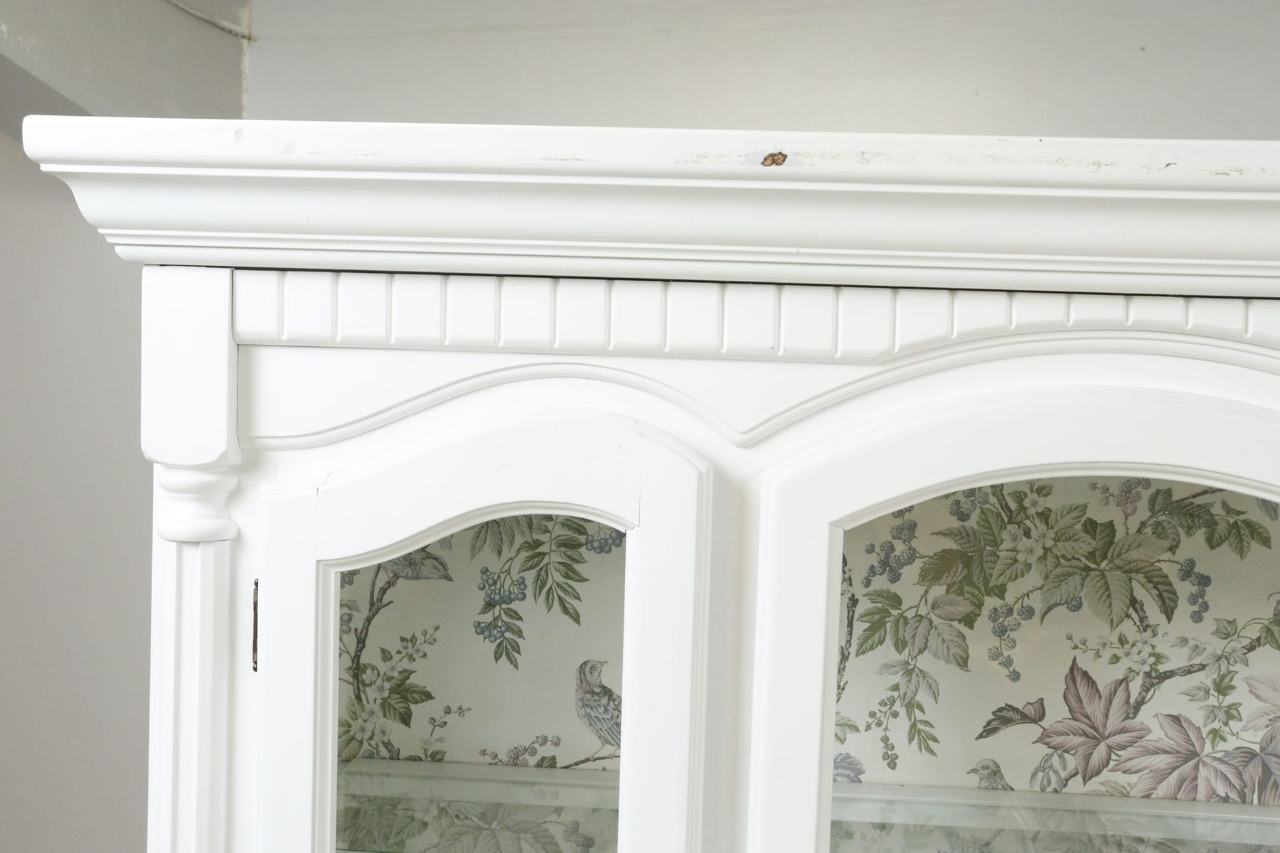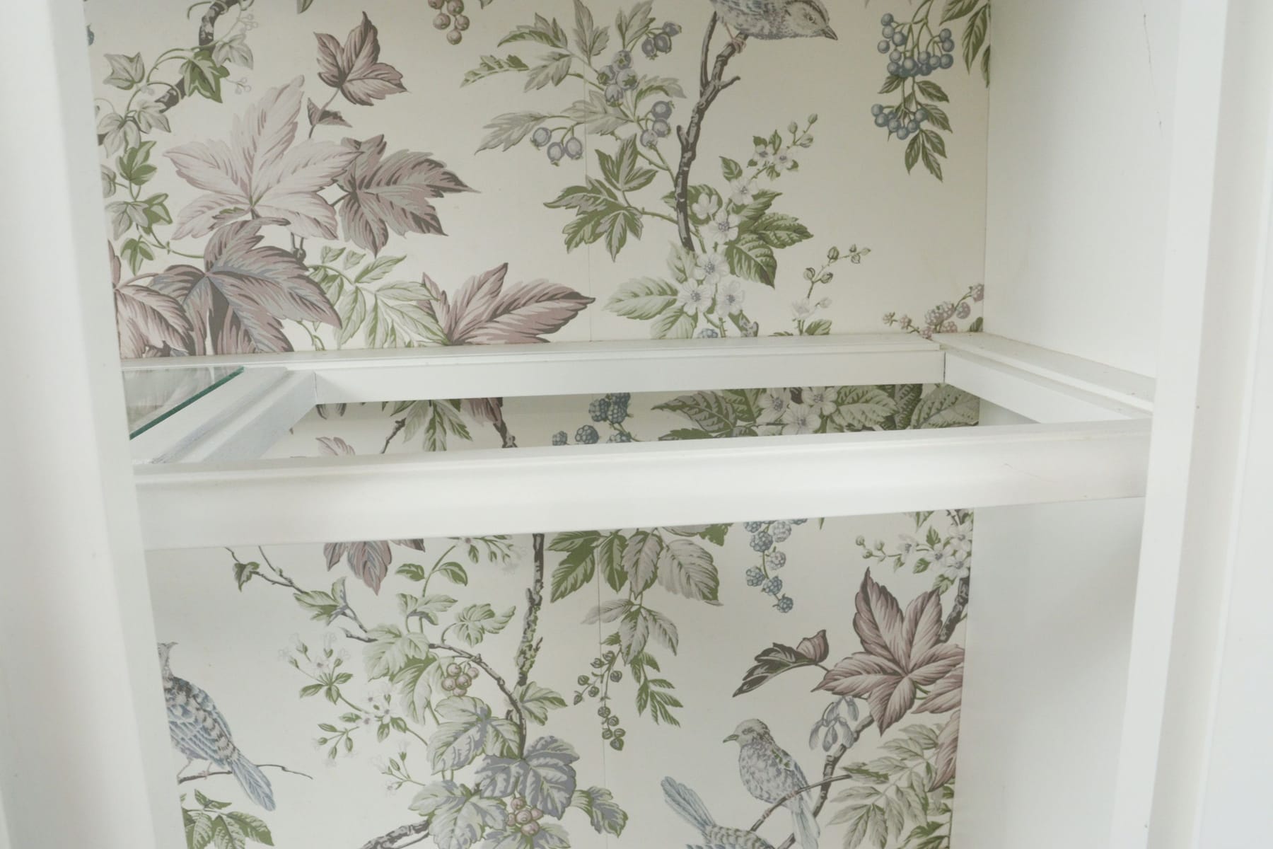 Vitrinskåp med tapetserad rygg och glashyllor