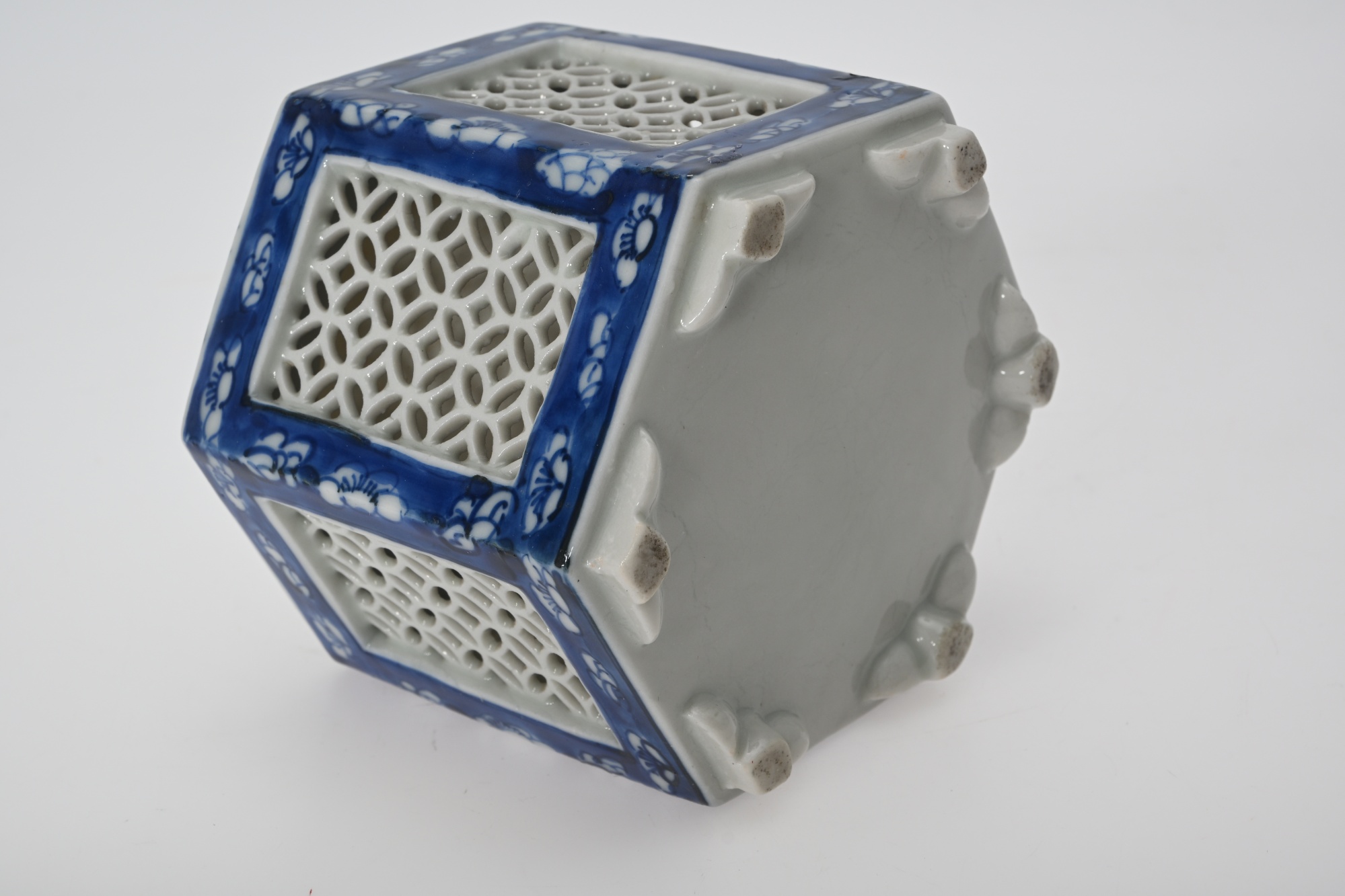 Sexkantig med målad och gallerdekor, fint skick, höjd 10.5 cm
