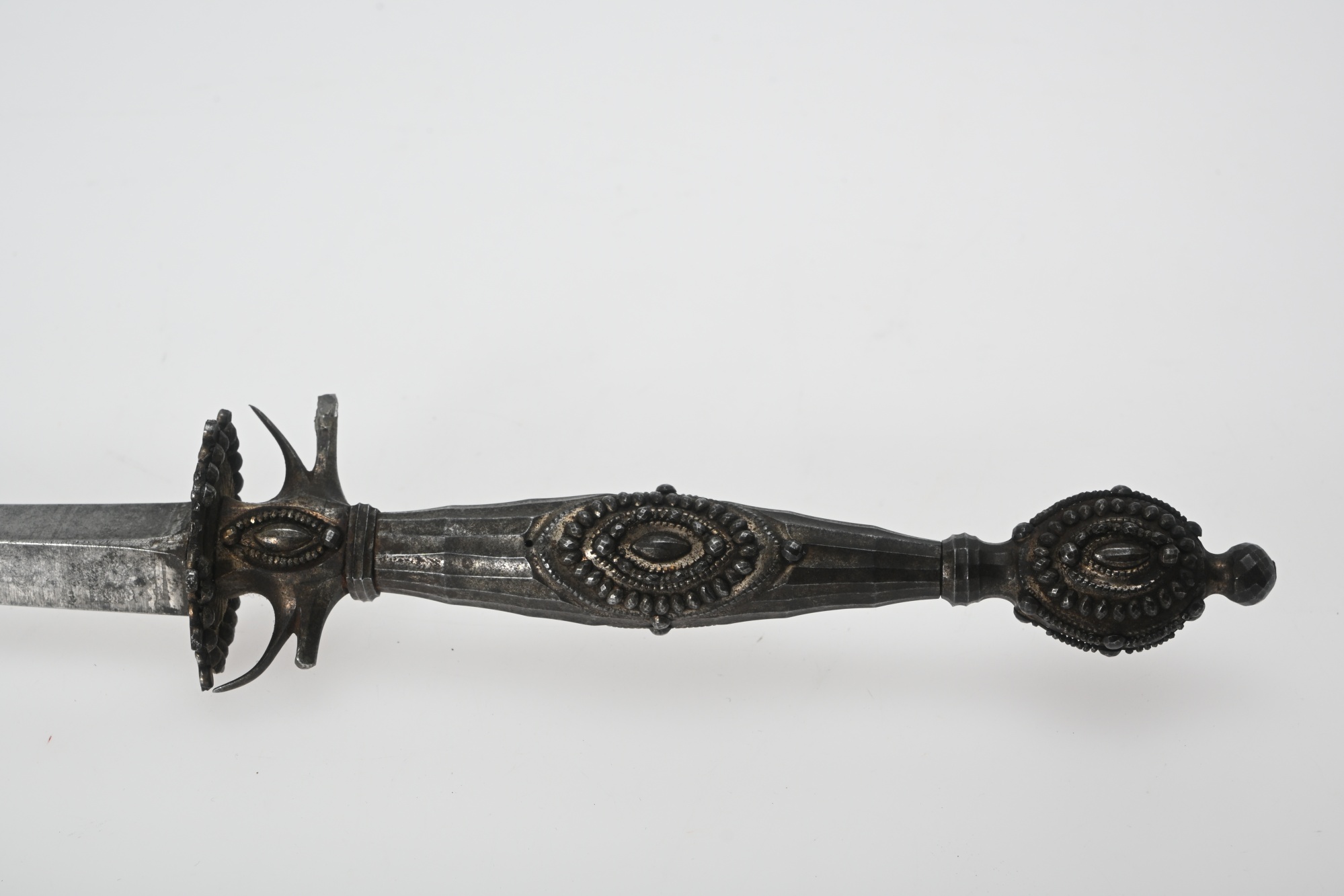 Treeggad stukatklinga med etsad dekor, kavelbygeln saknas, klingans längd 79.5 cm, totallängd 96 cm