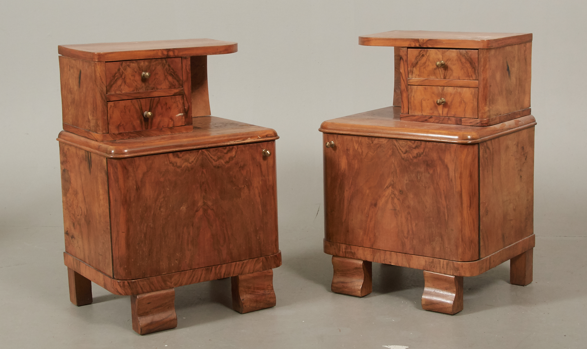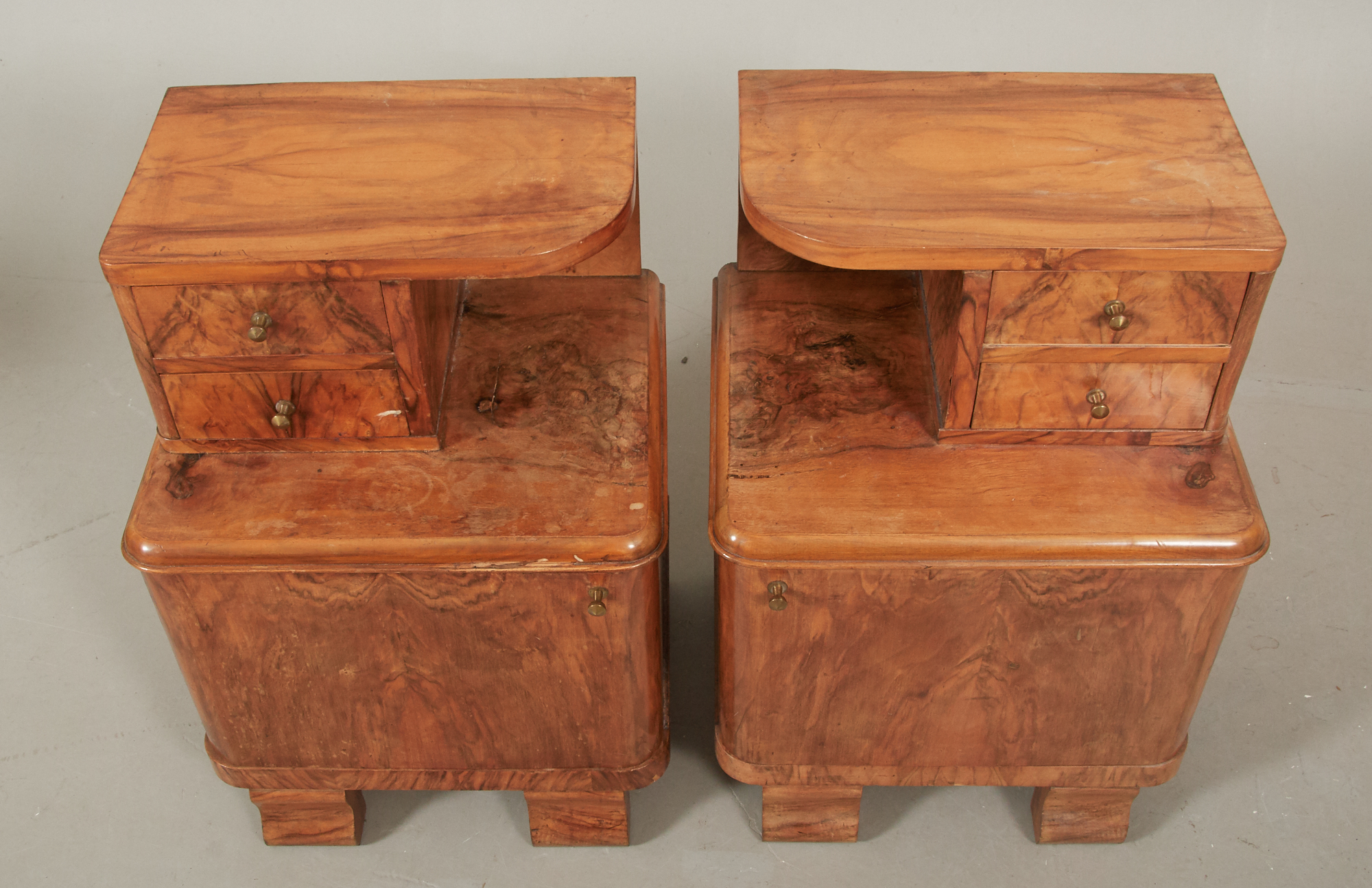 Ett par, 1900-talets första hälft, 2 utdragslådor, samt en dörr vardera, 44 x 38 cm, höjd 70 cm, åldersrelaterat bruksslitage, skador och fläckar förekommer.
