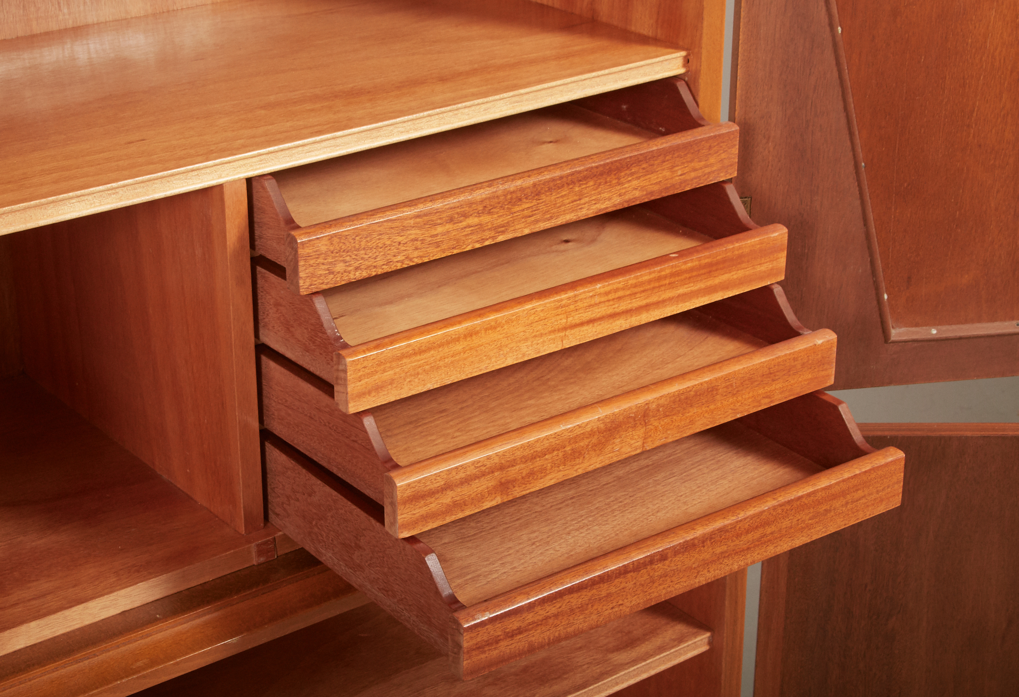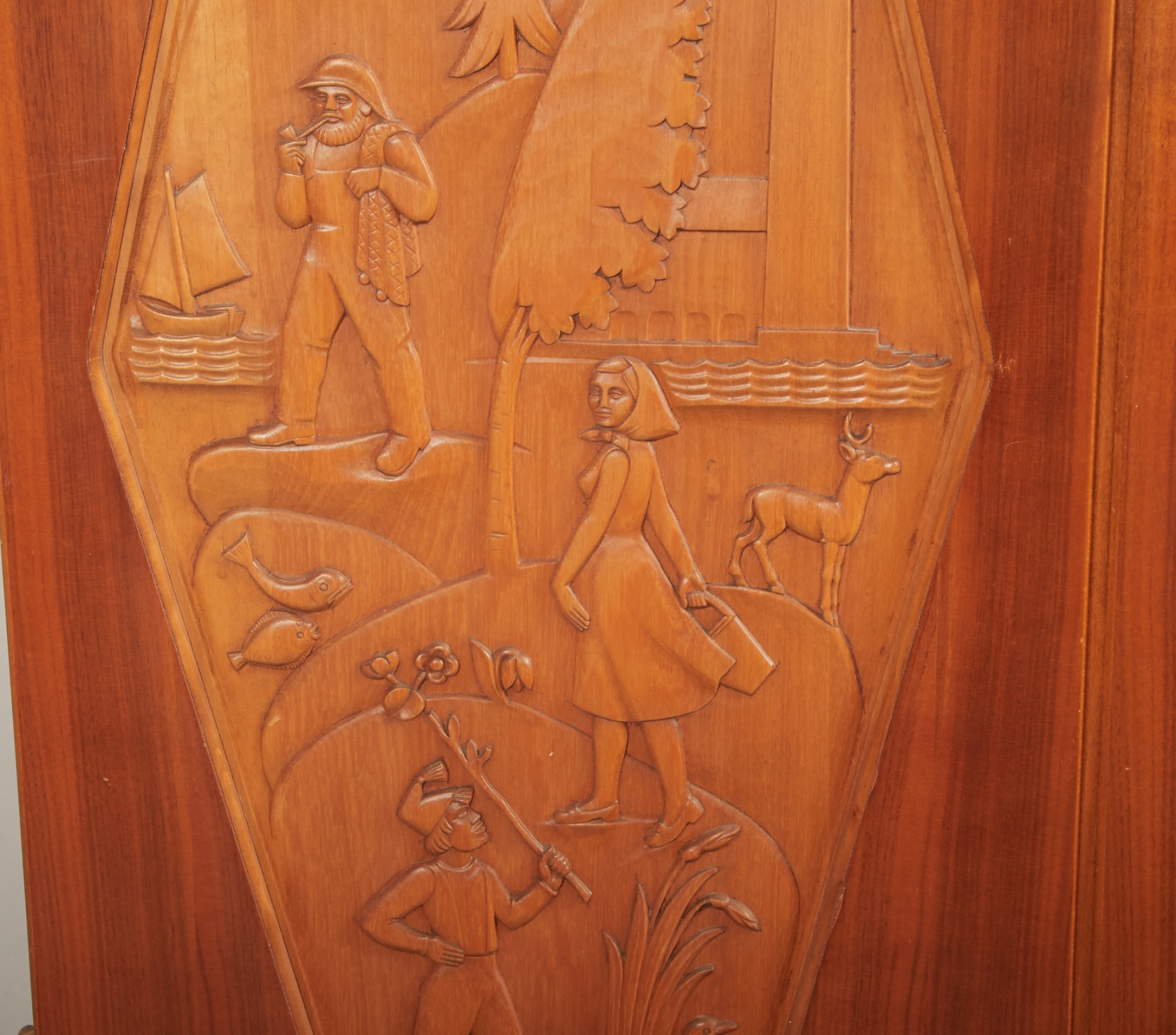 Signerat Erik Höglunds Bildh - Verkst Vetlanda 1959, 2-delat, 2 dörrpar med bakomliggande förvaring, översta dörrpar med dekor i relief, 91 x 40,5, höjd 160 cm, smärre bruksslitage.